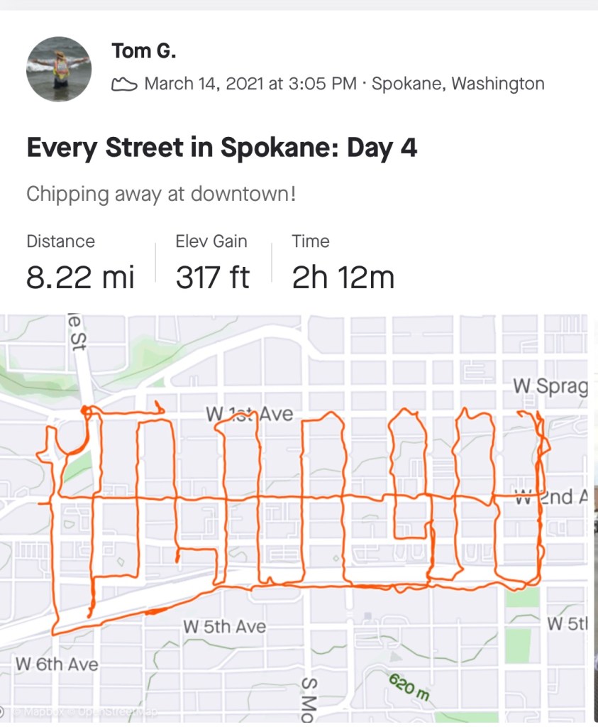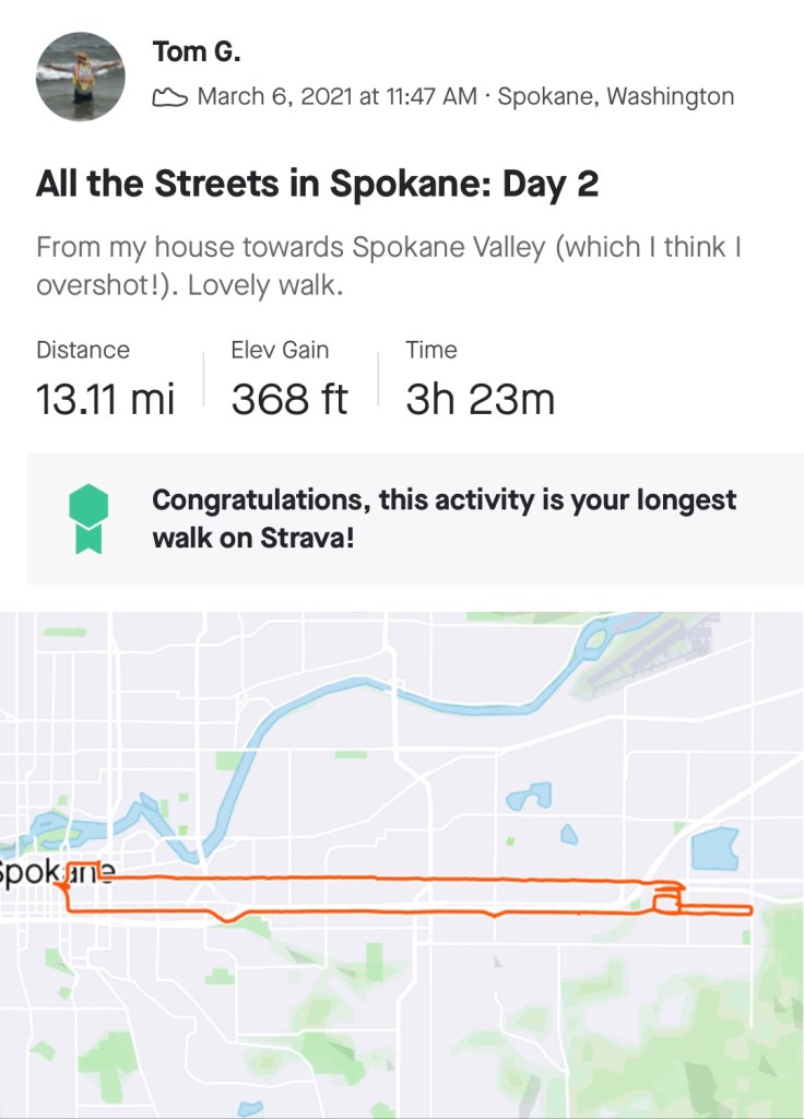 As I reflect on the feasibility of completing this endeavor, I’m struck by my internal ho-hum energy. I don’t think it really matters if I manage to walk every street in Spokane. And I’m not just saying that. Completion would be definitely be cool—a fun little feather in my cap—but being done isn’t the driver. It’s the doing that matters the most to me. But who knows, maybe consistent progress will shift my occasional saunter into a more focused and speedier endeavor. Maybe. But I doubt it.