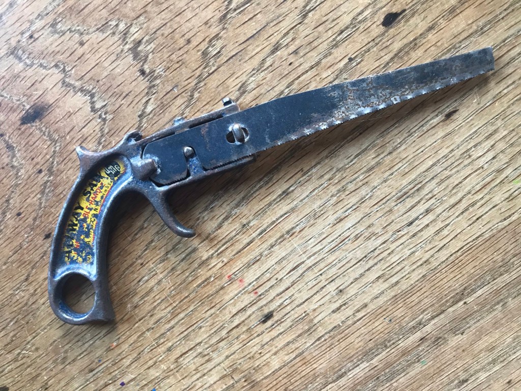 And a vintage and well-used Allway-brand mini-saw with a handle shaped like a pistol. But no dice. This thing, too, basically worthless.