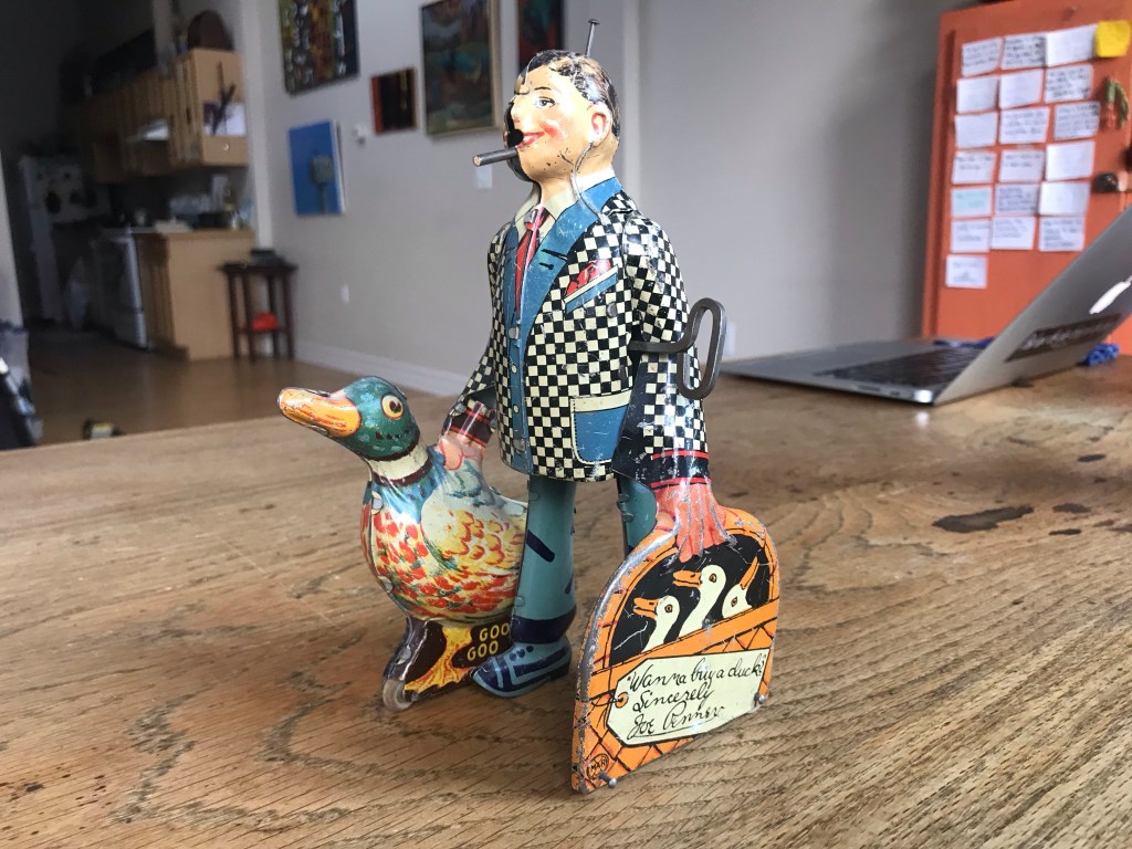 An antique 1934 tin toy (manufactured by Marx Co.) featuring cigar-smoking radio comedian Joe Penner and his duck, Goo Goo. It’s meant to wind up and scoot around, but unfortunately it’s no longer operating. The toy is constructed with bright, but faded lithographic colors and shows Penner carrying Goo Goo and a basket of ducks. The basket side depicts a note that reads, “Wanna buy a duck? Sincerely Joe Penner.” The original toy wore a hat, too. This one’s is lost in time.
