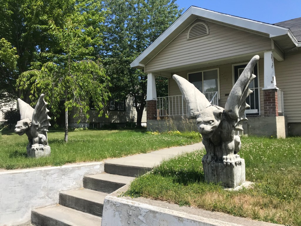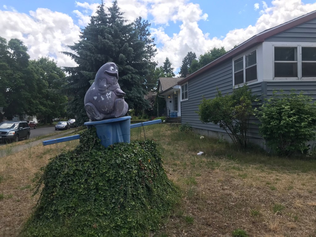 As I ticked off another square block, I snapped photos of curious yard decor: A front yard gargoyle and a weathered McDonald’s Grimace on a Rubbermaid pedestal. I wondered about the human need for expression—for altering a natural thing to make it ‘more appealing.’ All these yards and fences, buildings and signage—all done up in an effort to make a place feel more accommodating.