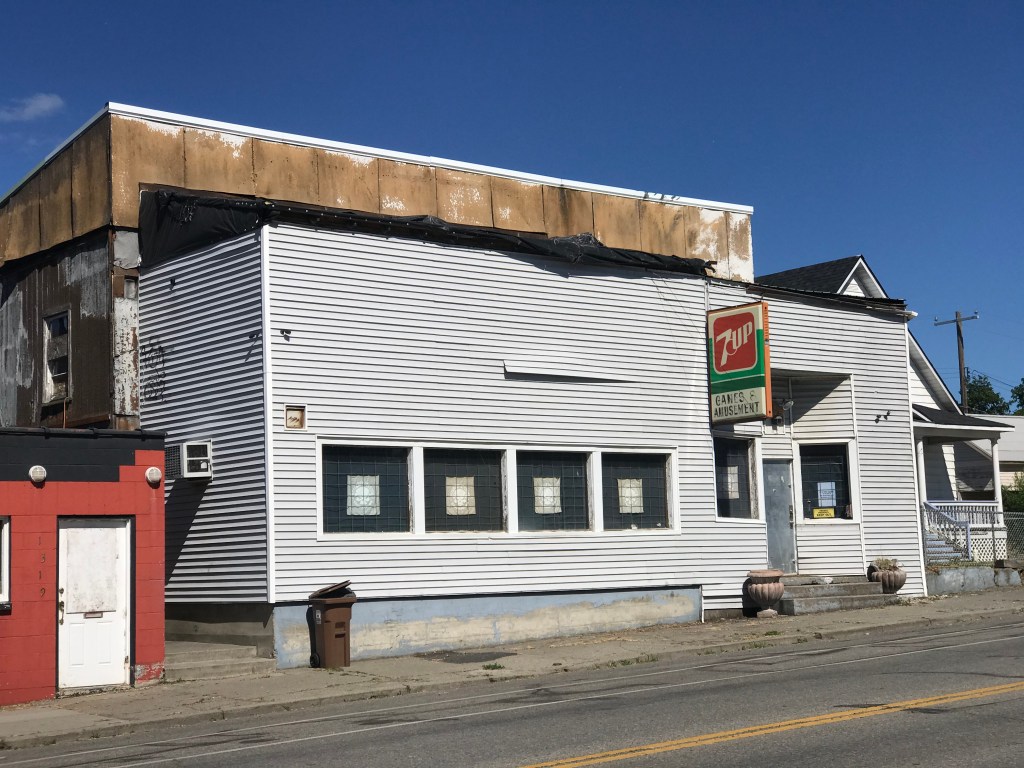 “Games and Amusement” underscores the faded 7-Up sign on North Howard. Each of the 4 barred windows frames a white silkscreened skull bordered with the text, “Superhit Studios Spokane WA.”