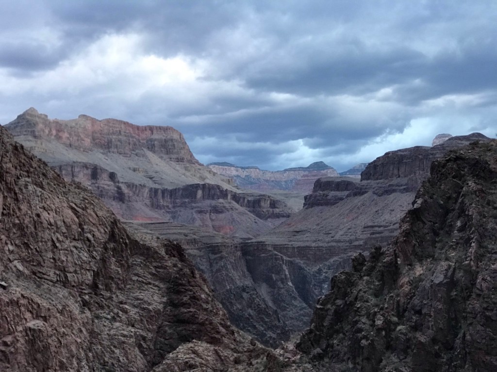 The Bright Angel Trail is known to be easier, less steep but a bit longer than its counterpart, South Kaibab. From the canyon’s bottom, it begins gradually and skirts the river while offering overwhelming views. Looming clouds and low light made everything more picturesque as we navigated an early flat section. For the first hour of the trail the only word I uttered was a gulping, “Wow.”