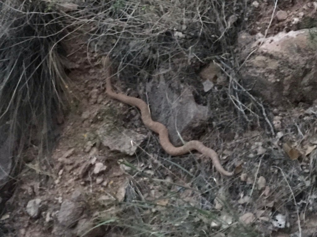 We both had hoped to see a rattler, but wouldn’t have predicted we’d do so as the evening cooled. Last time I encountered a rattlesnake on a trail was back in 2010 when I was running in the San Gabriel mountains just north of Los Angeles. It was a big, decorated thing, much longer, thicker, and more aggressive than this tan Grand Canyon variety. It coiled into a spring as I stood mortified, unsure what to do.
