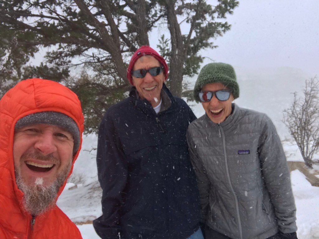 The three of us were riding a high. I, for one, marveled incessantly at the steepness of the Bright Angel Trail as it disappeared down into sideways-blowing flurries. “We did that?” I said. “Holy cow.” Cozy and warm in our puffy jackets and dry gloves we walked tightly together, expressing gratitude for all that happened, and had to happen, for us to be out here on this blustery morning. The sort of morning which, ironically, seemed perfect for a short little walk.